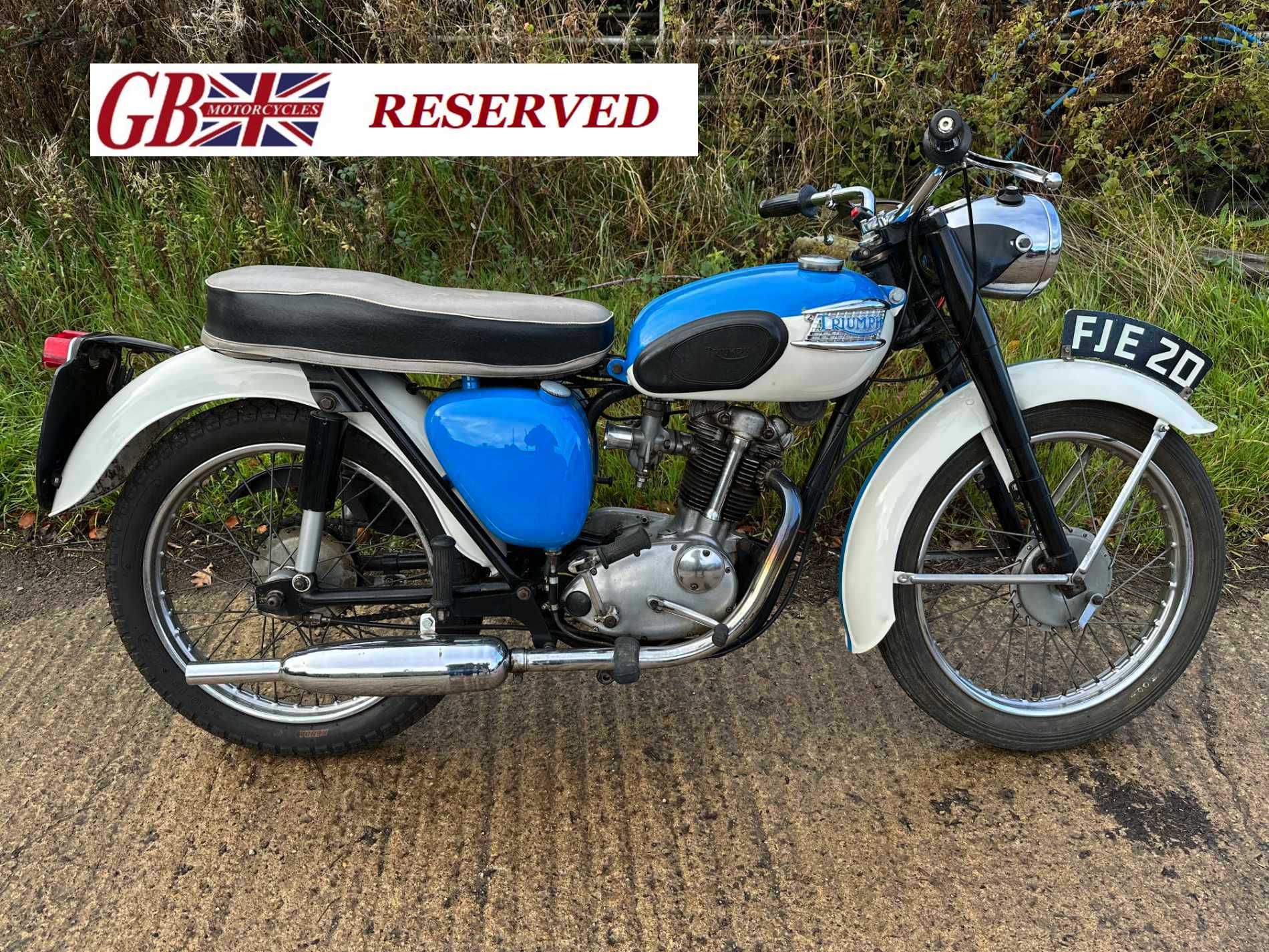 A matching numbers late Triumph T20B Bantam Cub in striking bright colours of Blue & White and with square barrel. With excellent paintwork it is a very smart small manageable machine which is easy to start and move around.